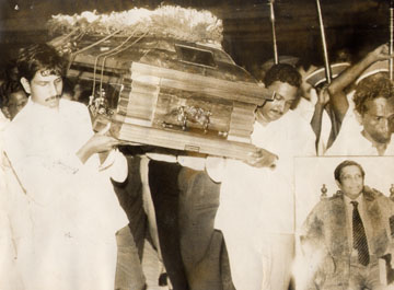 ඝාතනයට ලක්වූ කොළඹ සරසවි උපකුලපති ස්ටැන්ලි විජේසුන්දරගේ දේහය රැගෙන යන ඔහුගේ පුත් ශාලිත ඇතුළු ඥාතීන්.