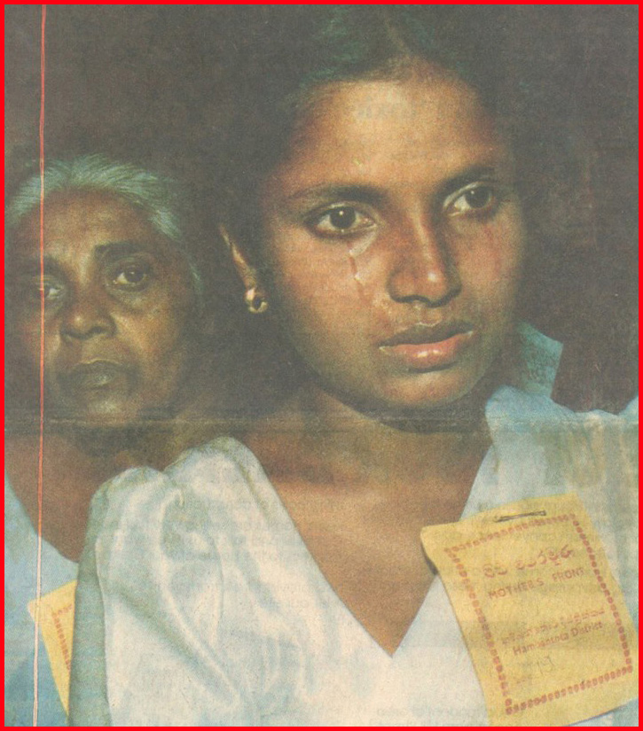 මව් පෙරමුණේ මංගල මහා සමුළුව 1991 පෙබරවාරි 19 කොළඹ නව නගර ශාලාවේදී පැවති අවස්ථාවේ පැමිණි සිව්දරු මවක් වූ හම්බන්තොට දුරුවගේ කුසුමාවතී 1989 දෙසැම්බර් 1 එජාප ආණ්ඩුව මගින් පැහැරගෙන අතුරුදහන් කල සිය සැමියා වූ බණ්ඩාරගේ පියදාස(36) ගේ සිද්ධිය පැහැදිලි කරමින්.