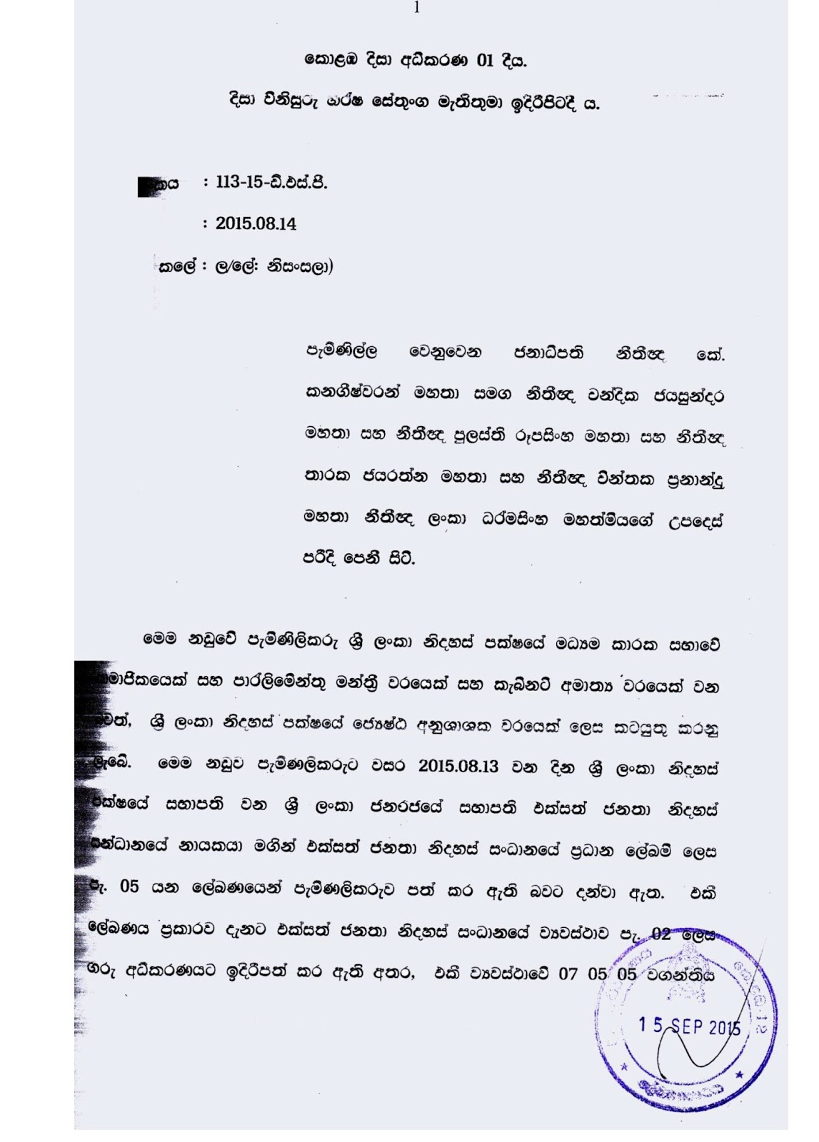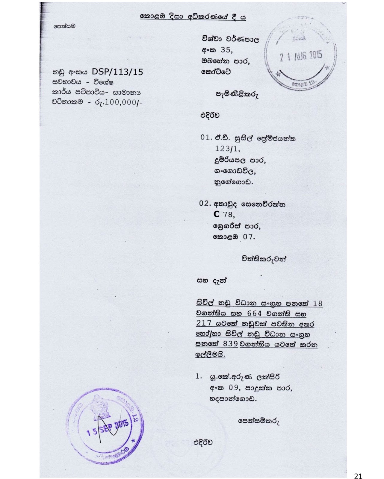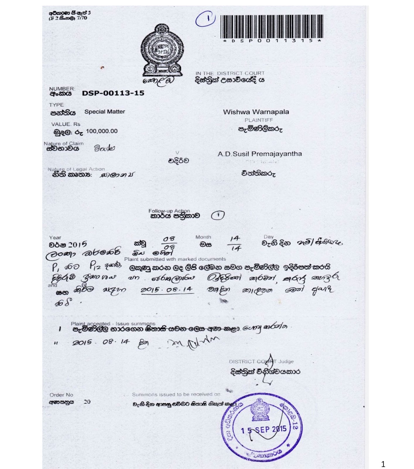 කෝට්ටේ, මාදිවෙල, ඔබහේන පාර, අංක 35 ලිපිනයේ විශ්වා වර්ණපාල විසින් එක්සත් ජනතා නිදහස් සංධානයේ ප්රධාන ලේකම්නුගේගොඩ, ගංගොඩවිල පාර, දුම්රිය පල පාර, 123/1 ලිපිනයේ සුසිල් ප්රේම්ජයන්ත ට සහ එක්සත් ජනතා නිදහස් සංධානයේ උපසභාපතිවරයෙක් වන කොළඹ 7, ග්රෙගරීස් පාර, C 78, ලිපිනයේ ආතාවුද සෙනෙවිරත්නට එරෙහිව 2015 අගෝස්තු 14 දින කොළඹ දිසා අධිකරනයේ නඩු අංක DSP/113/15 නඩුව පැවරීම. (කොළඹ දිසා අධිකරණයේ නඩු ගොනුවේ පළමු කාර්ය සටහන මෙසේ ය.)