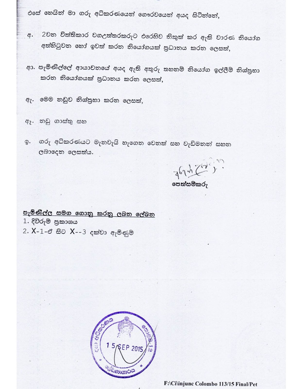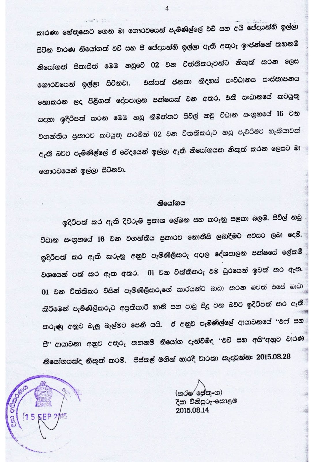 සුසිල් ප්රේම්ජයන්ත විසින් ජාතික ලැයිස්තුව (2015 පාර්ලිමේන්තු මැතිවරණයෙන් පරාජයට පත් වූ අයද ඇතුළත්) නම් කරමින් මැතිවරණ කොමසාරිස් වෙත යවන ලද X-1 දරන ලේඛනය පහත දැක්වේ…