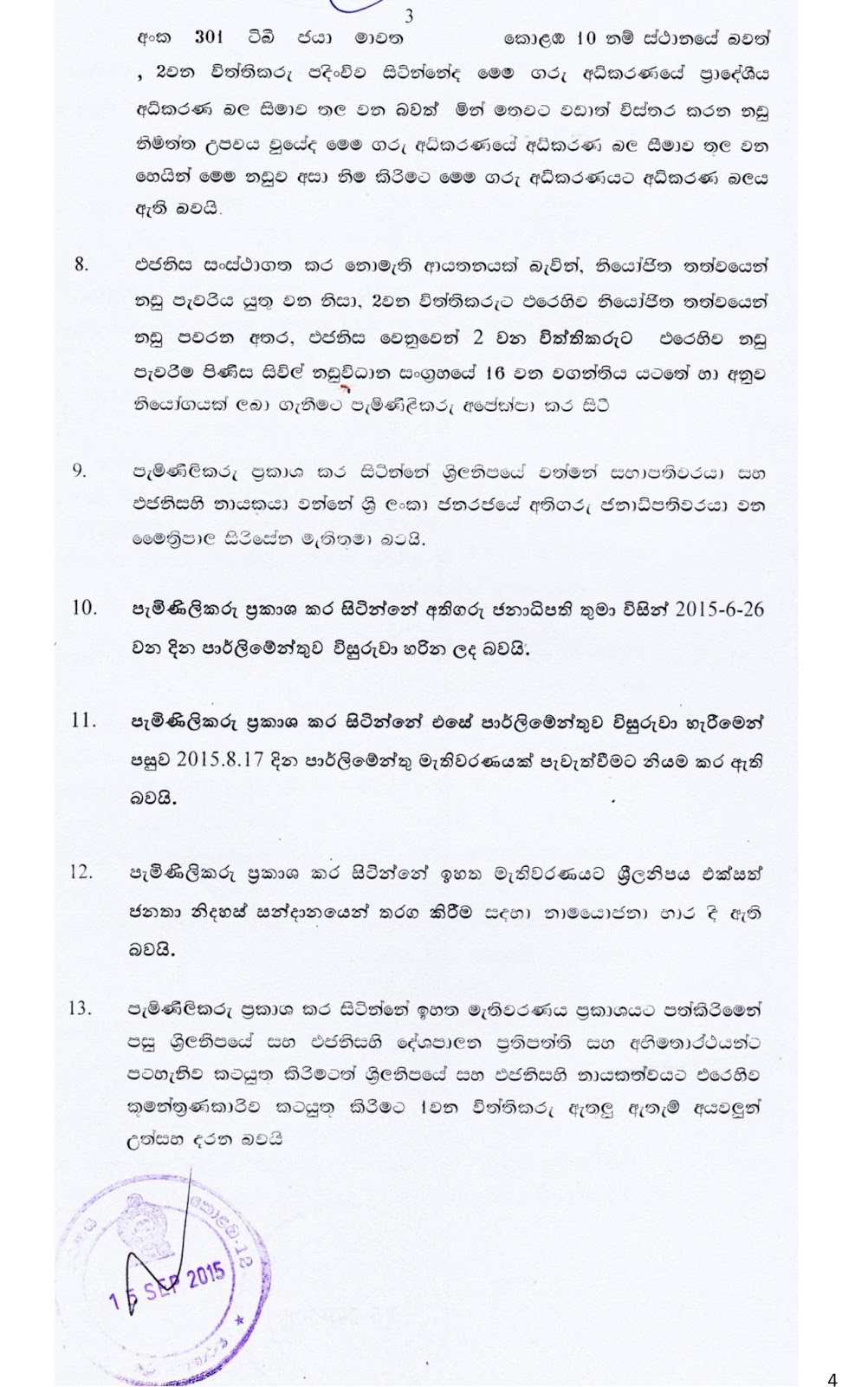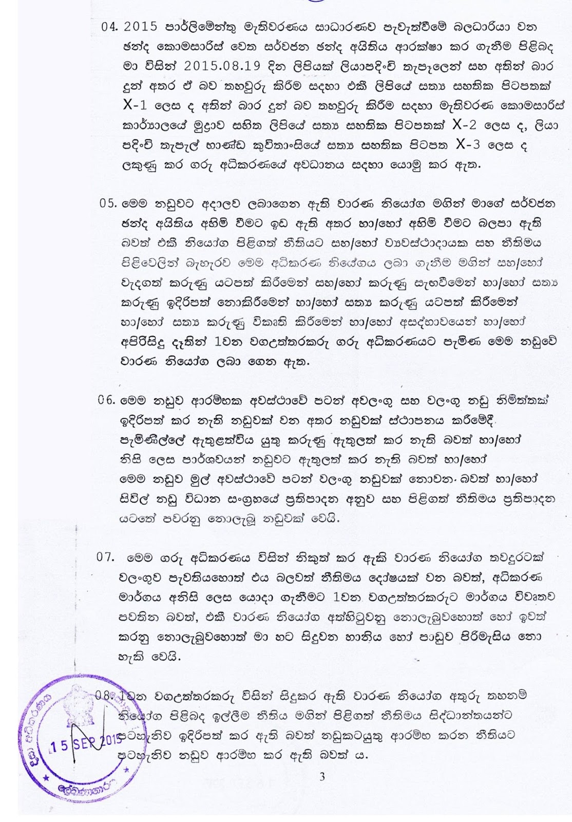 විශ්වා වර්ණපාල විසින් ඉහත නියෝග 2015.08.14 දින(සිකුරාදා) කොළඹ දිසා අධිකරණයෙන් ලබා ගත් අතර 2015.08.17 දින (සදුදා) 2015 පාර්ලිමේන්තු මැතිවරණය පවත්වන ලදී.