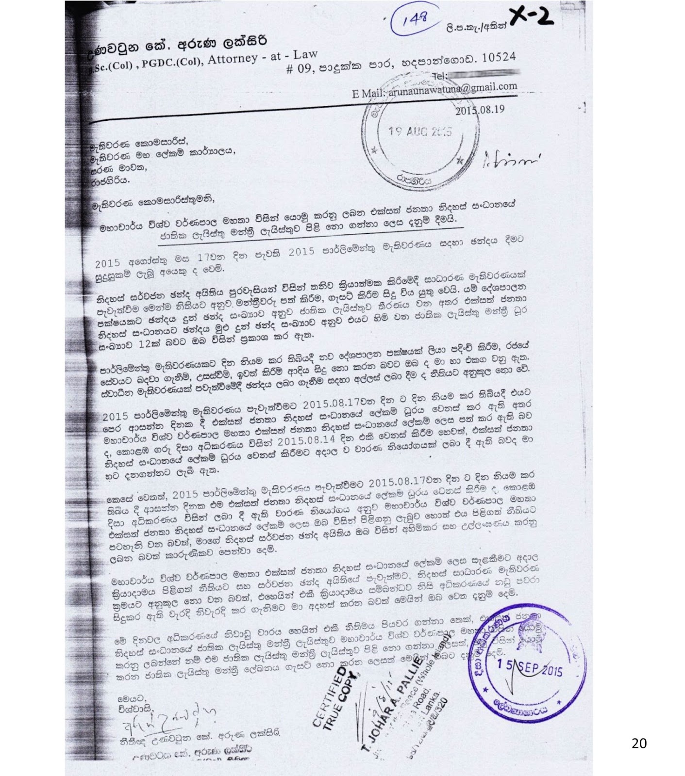 2015 පාර්ලිමේන්තු මැතිවරණයට අදාල ජාතික ලැයිස්තුව නම් කිරීමේදී යම් අක්රමිකතාවයක් වීමට ඉඩ ඇති හෙයින් සහ එය නිදහස් මැතිවරණ ක්රමයට අනුකූල නොවන හෙයින් සහ ඡන්ද අයිතියට උල්ලංඝණය කරන හෙයින්, ජනතාව විසින් පරාජයට පත් කළ අපේක්ෂකයන් ජාතික ලැයිස්තුවෙන් පාර්ලිමේන්තුවට ඇතුල්වීමවළක්වා ගැනීම සදහා එක් නීතීඥවරයෙක් 2015.08.19 දින මහාචාර්ය විශ්ව වර්ණපාල මහතා විසින් යොමු කරනු ලබන එක්සත් ජනතා නිදහස් සංධානයේ ජාතික ලැයිස්තු මන්ත්රී ලැයිස්තුව පිළිනොගන්නා ලෙස දැනුම් දෙමින් මැතිවරණ කොමසාරිස් වෙත දැනුම් දීමක් කර තිබුණි.(එකී ලිපිය පහත දැක්වේ.)