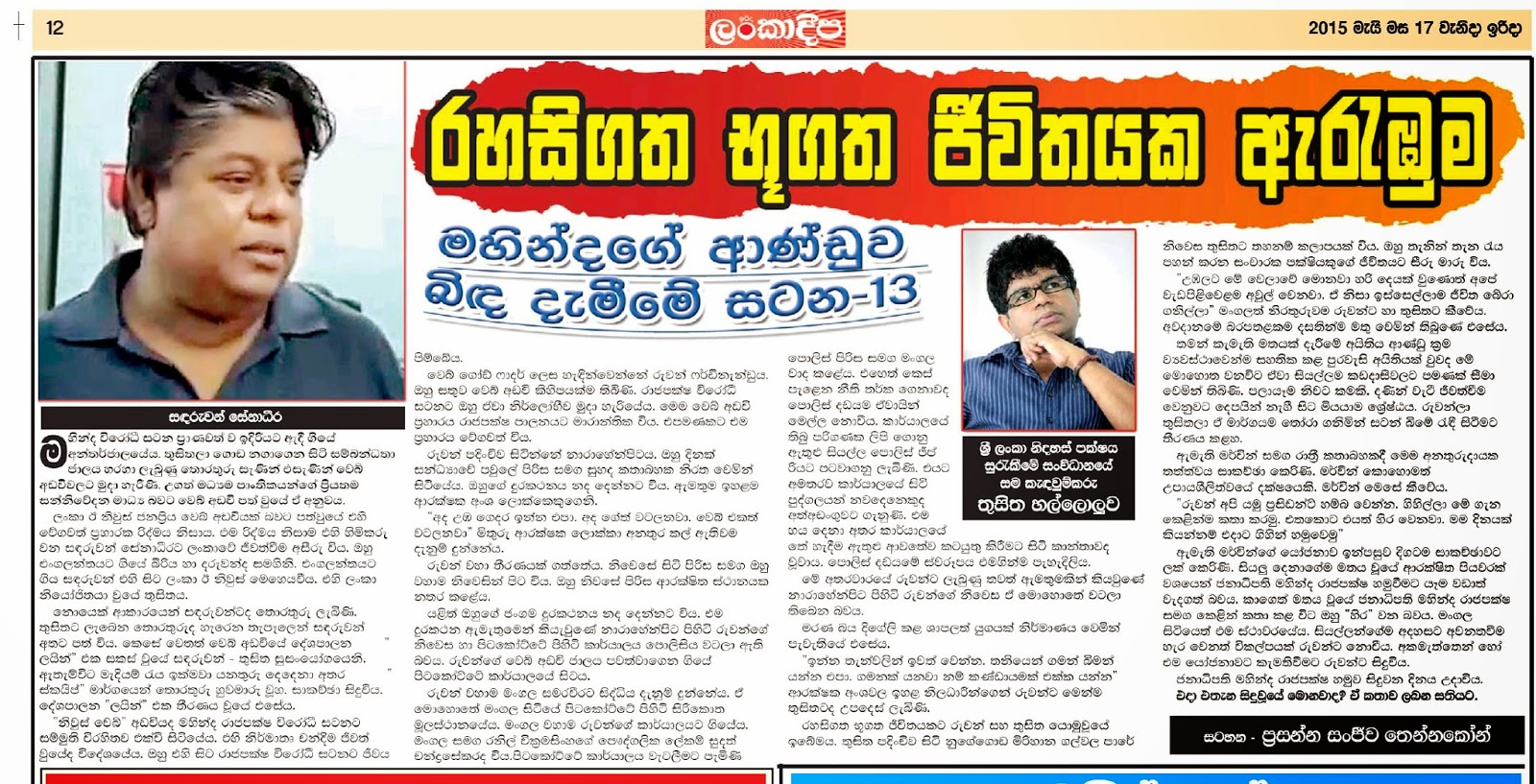 ඉරිදා ලංකාදිප පුවත්පතේ සුජිව ප්රසන්න තෙන්නකොන් හට මසකට රුපියල් ලක්ෂය බැගින් ලබාදෙමින් තමන් මාරම් වැඩකාරයෙක් බව රටට පෙන්විමට කටයුතු කරන තුසිත අන්තිමට නොදැනම ඇනගෙන් තිබේ.සතිපතා ඉරිදා ලංකාදිප පුවත් පතේ “මහින්දගේ ආණ්ඩුව බිද දැමිමේ සටන”අද 2015 05 17 යනුවෙන් ලියා ගන්නා වර්ණනාව හරහා ලංකා ඊ නිවුස්,ලංකා නිවුස් වෙබ්,ලංකා එක්ස් නිවුස් වැනි මහින්දට මඩ ගැසූ වෙබ් අඩවි මුදලට බොරු ලියා පලකල ඇති බව තහවුරු කර තිබේ.