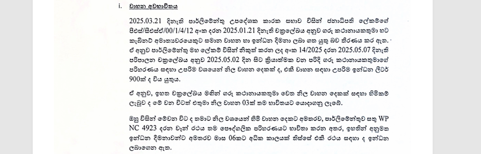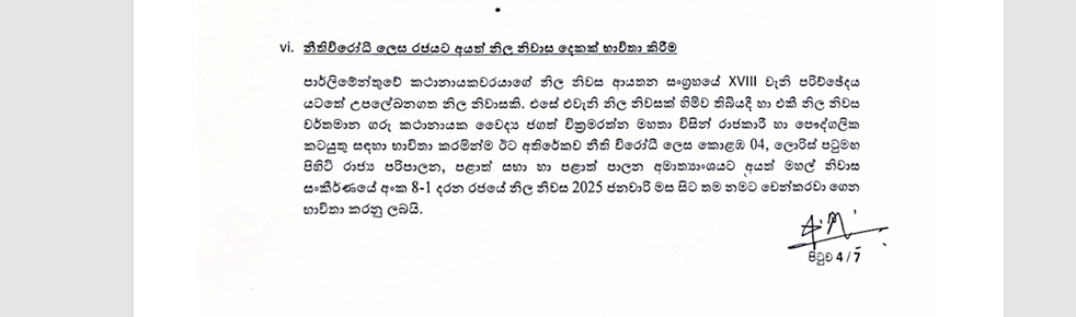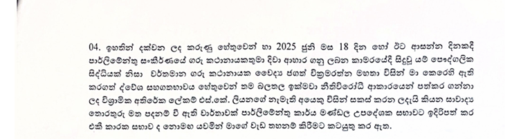 “ඉහතින් දක්වන ලද කරුණු හේතුවෙන් හා 2025 ජුනි මස 18 දින හෝ ඊට ආසන්න දිනකදී පාර්ලිමේන්තු සංකීර්ණයේ ගරු කථානායකතුමා දිවා ආහාර ගනු ලබන කාමරයේදී සිදුවූ යම් පෞද්ගලික සිද්ධියක් නිසා වර්තමාන ගරු කථානායක වෛද්ය ජගත් වික්රමරත්න මහතා විසින් මා කෙරෙහි ඇති කරගත් ද්වේශ සහගතභාවය හේතුවෙන් තම බලතල ඉක්මවා නීතිවිරෝධී ආකාරයෙන් පත්කර ගන්නා ලද විශ්රාමික අතිරේක ලේකම් එස්.කේ. ලියනගේ නැමැති අයෙකු විසින් සකස් කරන ලදැයි කියන සාවද්ය තොරතුරු මත පදනම් වී ඇති වාර්තාවක් පාර්ලිමේන්තු කාර්ය මණ්ඩල උපදේශක සභාවට ඉදිරිපත් කර එකී කාරක සභාව ද නොමඟ යවමින් මාගේ වැඩ තහනම් කිරීමට කටයුතු කර ඇත.