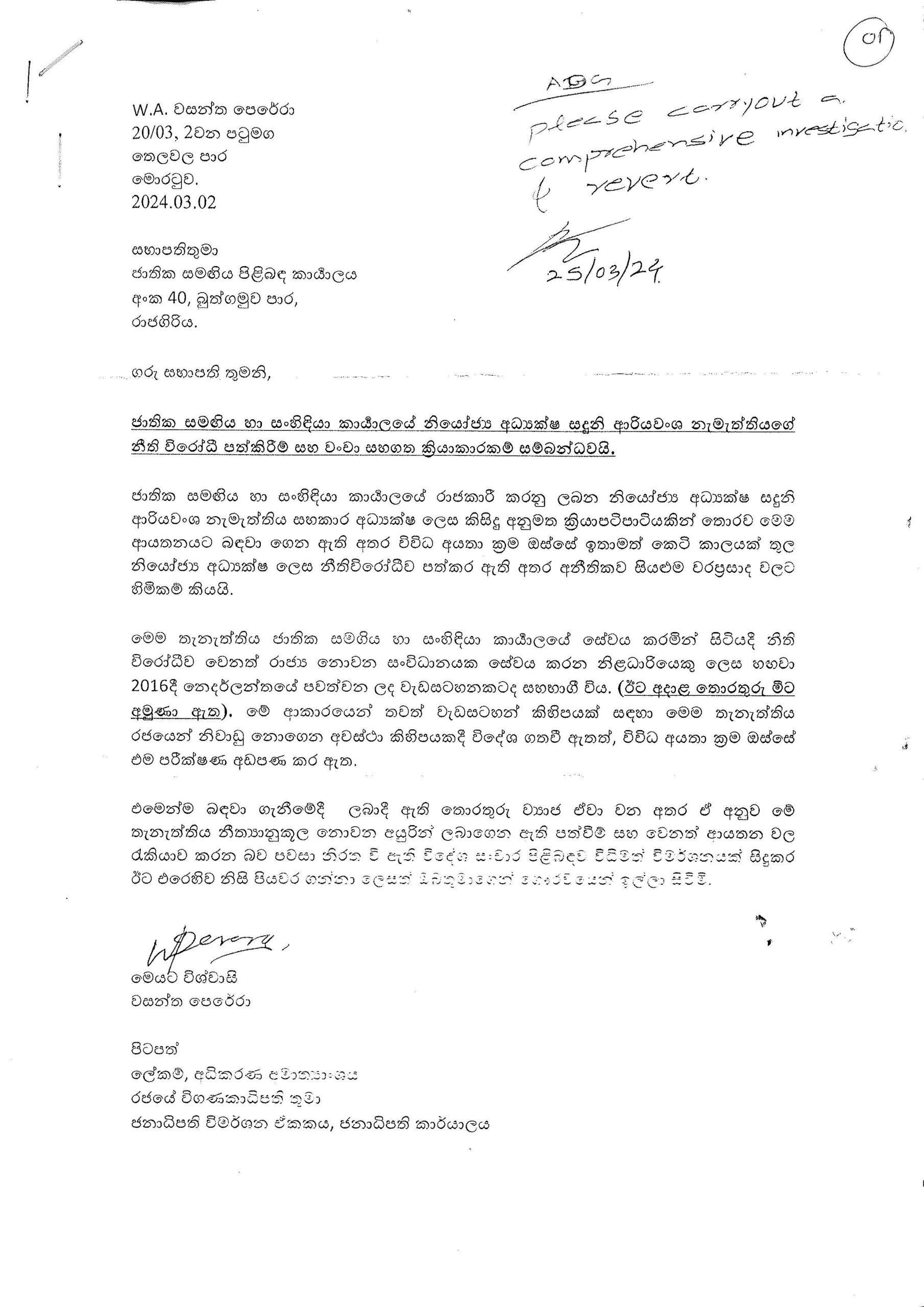 W.A වසන්ත පෙරේරා විසින් යොමුකර ඇති පැමිණිල්ල