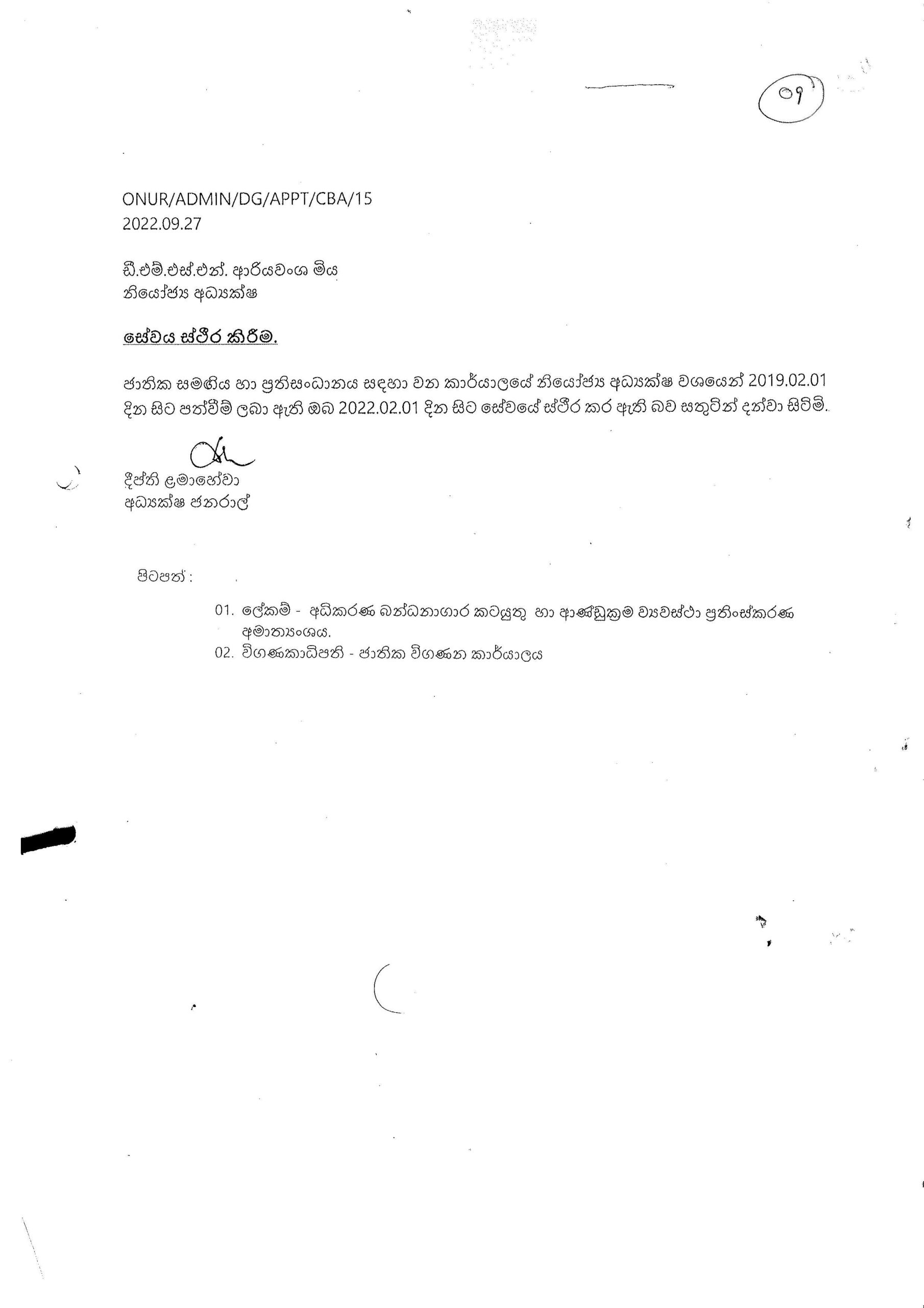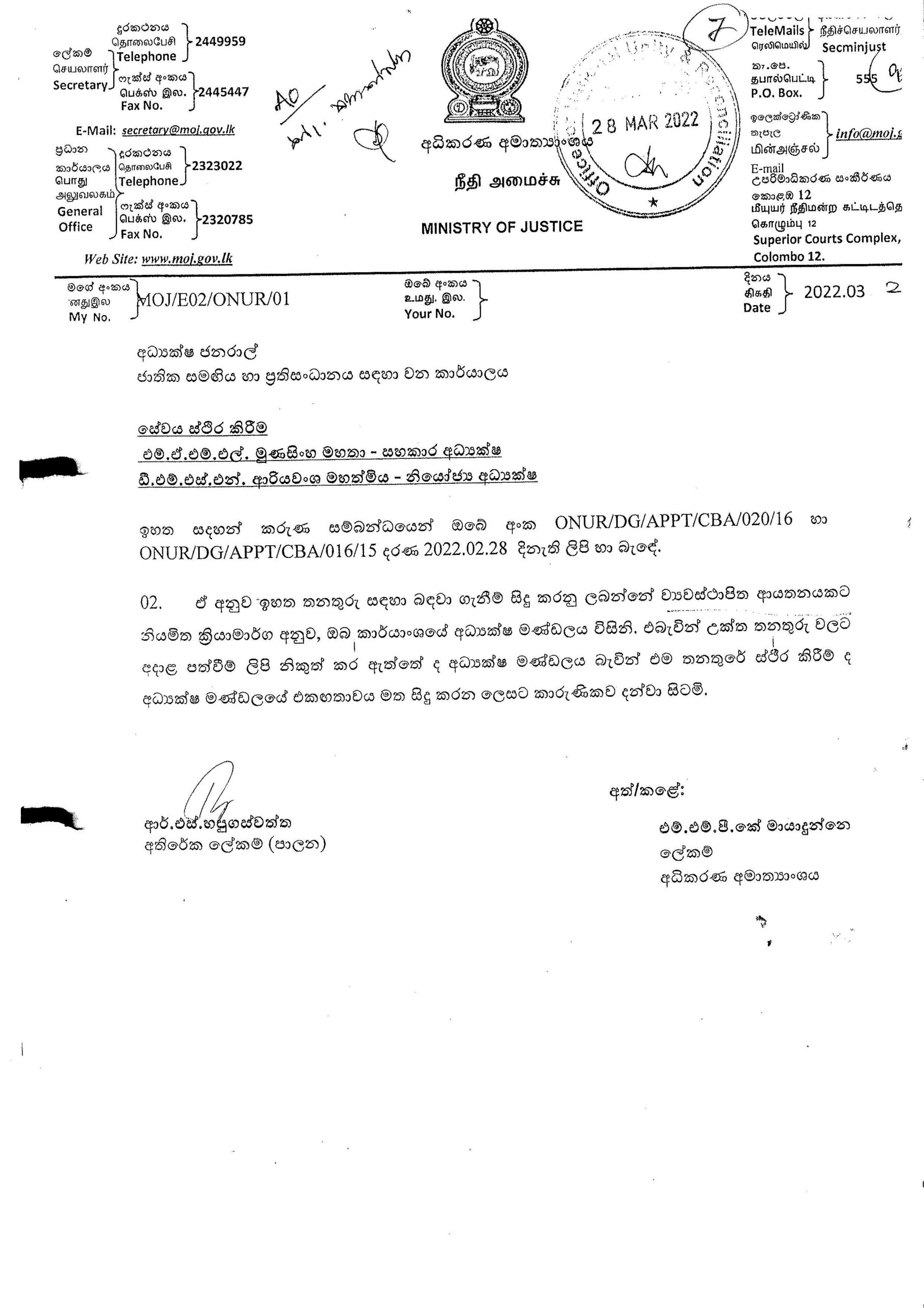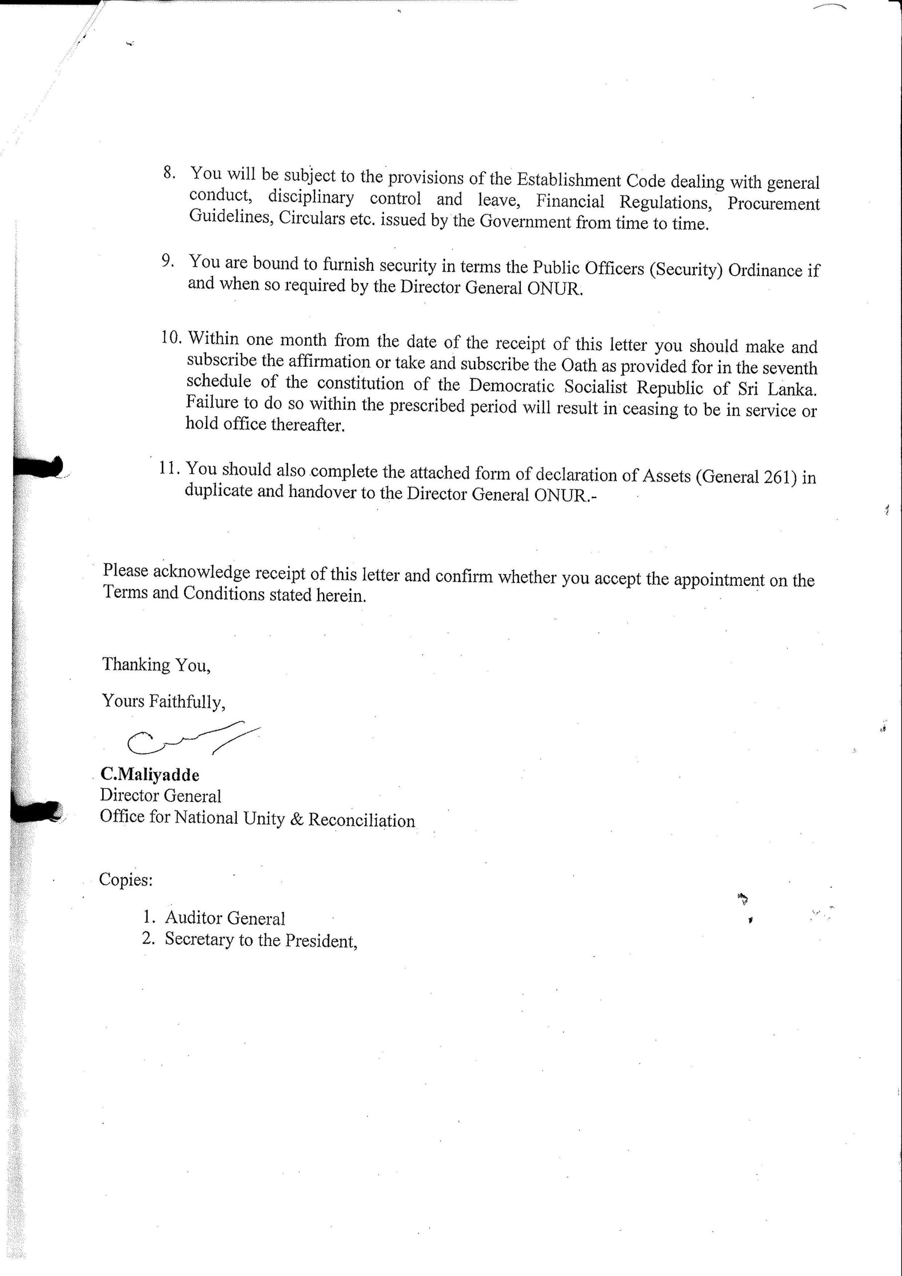 ඒ අතරතුර මෙම කාර්යාලය සඳහා ඔහු අධ්යක්ෂ ජනරාල් තනතුරට පත් කිරීමට අධිකරණ අමාත්යාංශයේ ලේකම්වරිය කටයුතු කළ අතර ( එය ඉතා වැදගත් වන්නේ, මේම කාර්යාලය සදහා දමිල භාෂාව හැසිරවිය හැකි නිලධාරීයෙකු අත්යාවශ්ය ව පැවැති නිසාය), එම ලිපිය ලැබීමට පෙර මෙම ආයතනයේ සභාපතිවරයා විසින් ඔහුව විශ්රාම ගැන්වීමටත්, ඒ වෙනුවට සඳුනි ආර්යවංශ පත් කිරීමටත් කටයුතු කර ඇත.