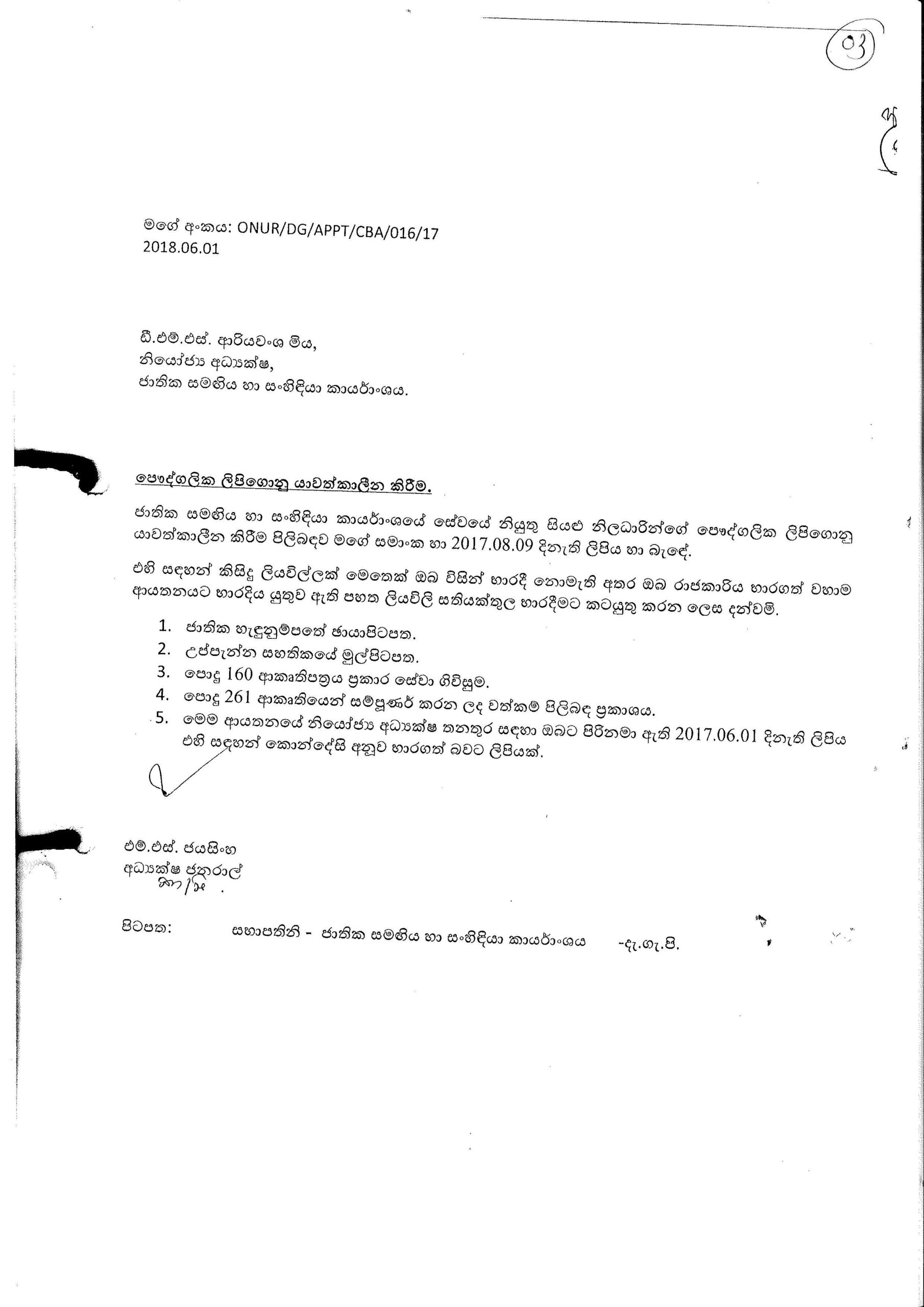 නමුත් අදාල නිළධාරියා අද සැප්තැම්බර් 30 සිට විශ්රාම යාමට නියමිත නමුත් අමාත්යාංශයේ ලේකම් තුමියගේ උපදෙස් අනුව තව දුරටත් මෙම කාර්යාලයේ වැඩ බැලීමට එකඟව සිටි නමුත් ආයතනයේ සභාපතිවරයාගේ (විජිත් රොහාන් ප්රනාන්දු) සහාය ලබන නියමිත සුදුසුකම් සපුරා නොමැති අයෙක් (සඳුනි ආරියවංශ) අදාල තනතුරේ වැඩ බැලීමට පත් කිරීමට සභාපතිවරයා කටයුතු කරනු ලැබීය. මේ සඳහා අධ්යක්ෂ මණ්ඩලය නොමඟ යවමින් එකඟතාවය ඉතා සූක්ෂමව ලබා ගැනීමට සභාපති වරයා කටයුතු කල අතර ඒ සඳහා මෙම කාර්යාලයට අමාත්යාංශය නියෝජනය කිරීමට පත් කර ඇති අතිරේක ලේකම් වරිය (ආර්. පී. එස්. සමන්කුමාරි) සහාය ලබා දී ඇත.