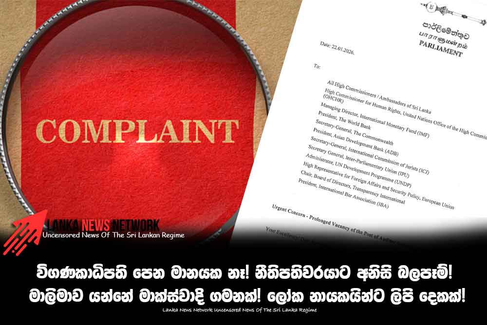 මාස ගණනක් තිස්සේ විගණකාධිපති පත් නොකර නීතිපතිවරයාට අනිසි බලපෑම් එල්ල කරමින් ප්රජාතන්ත්ර විරෝධී පාලනයක් ගෙන යන බවට ජනාධිපති ප්රමුඛ වර්තමාන ආණ්ඩුවට එරෙහිව පාර්ලිමේන්තු මන්ත්රී නීතිඥ සුජීව සේනසිංහ ජාත්යන්තර සංවිධානන හා රාජ්ය නායකයින් වෙත ලිඛිත දැනුම් දීමක් කර තිබේන බව අප දේශපාලන වාර්තාකරු අනාවරණය කළා.සුජීව සේනසිංහගේ අත්සනින් යුතු එම ලිපිය රාජ්ය නායකයින්ට, ජාත්යන්තර සංවිධාන වලට, සියලු තානාපතිවරුන්ට සහ මහා කොමසාරිස්වරුන්ට අද (23) යොමු කර තිබේන බවයි ඔහු සදහන් කළේ.