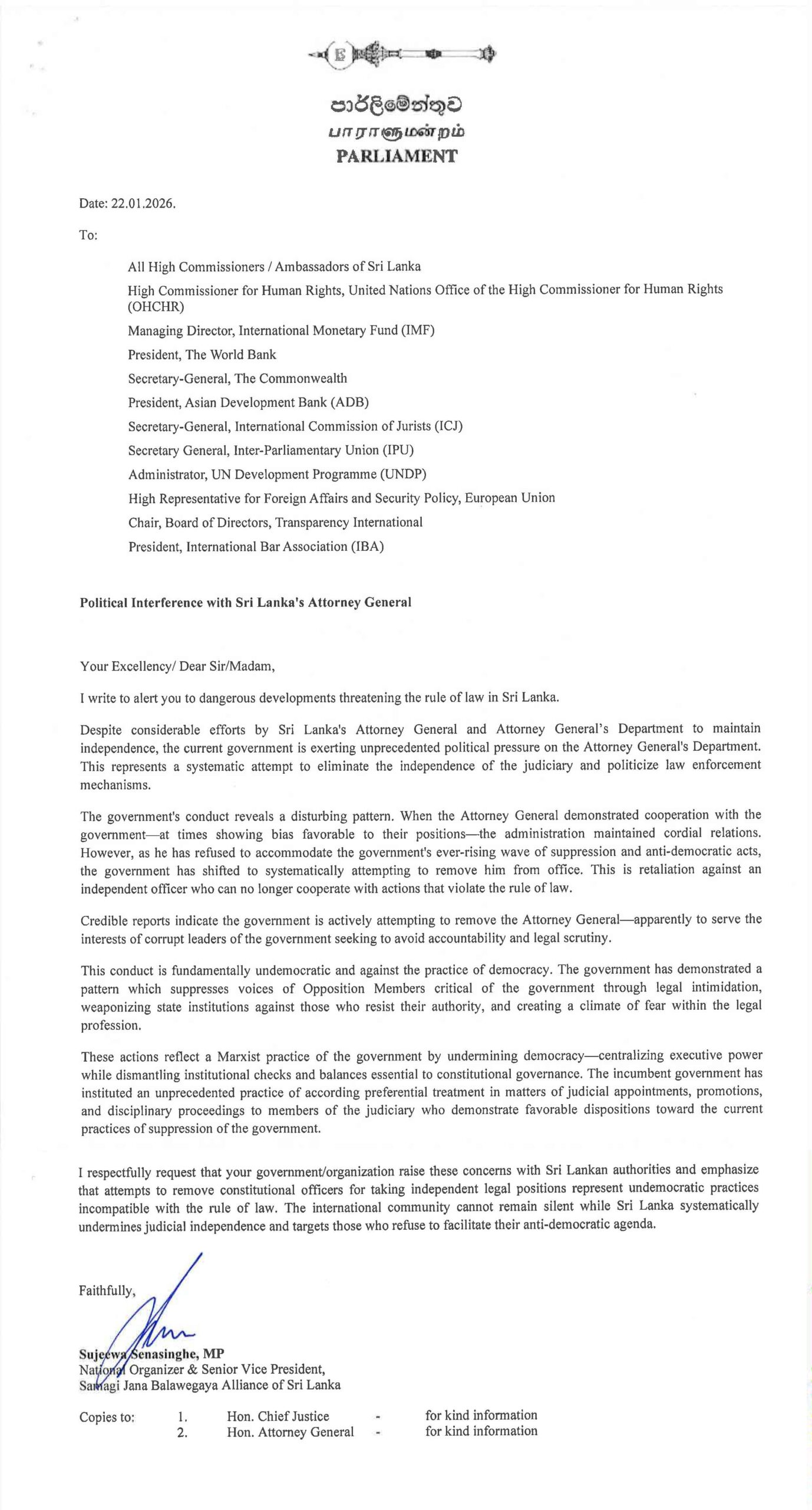 1 respectfully request that your government/organization raise these concerns with Sri Lankan authorities and emphasize that attempts to remove constitutional officers for taking independent legal positions represent undemocratic practices incompatible with the rule of law. The international community cannot remain silent while Sri Lanka systematically undermines judicial independence and targets those who refuse to facilitate their anti- democratic agenda.