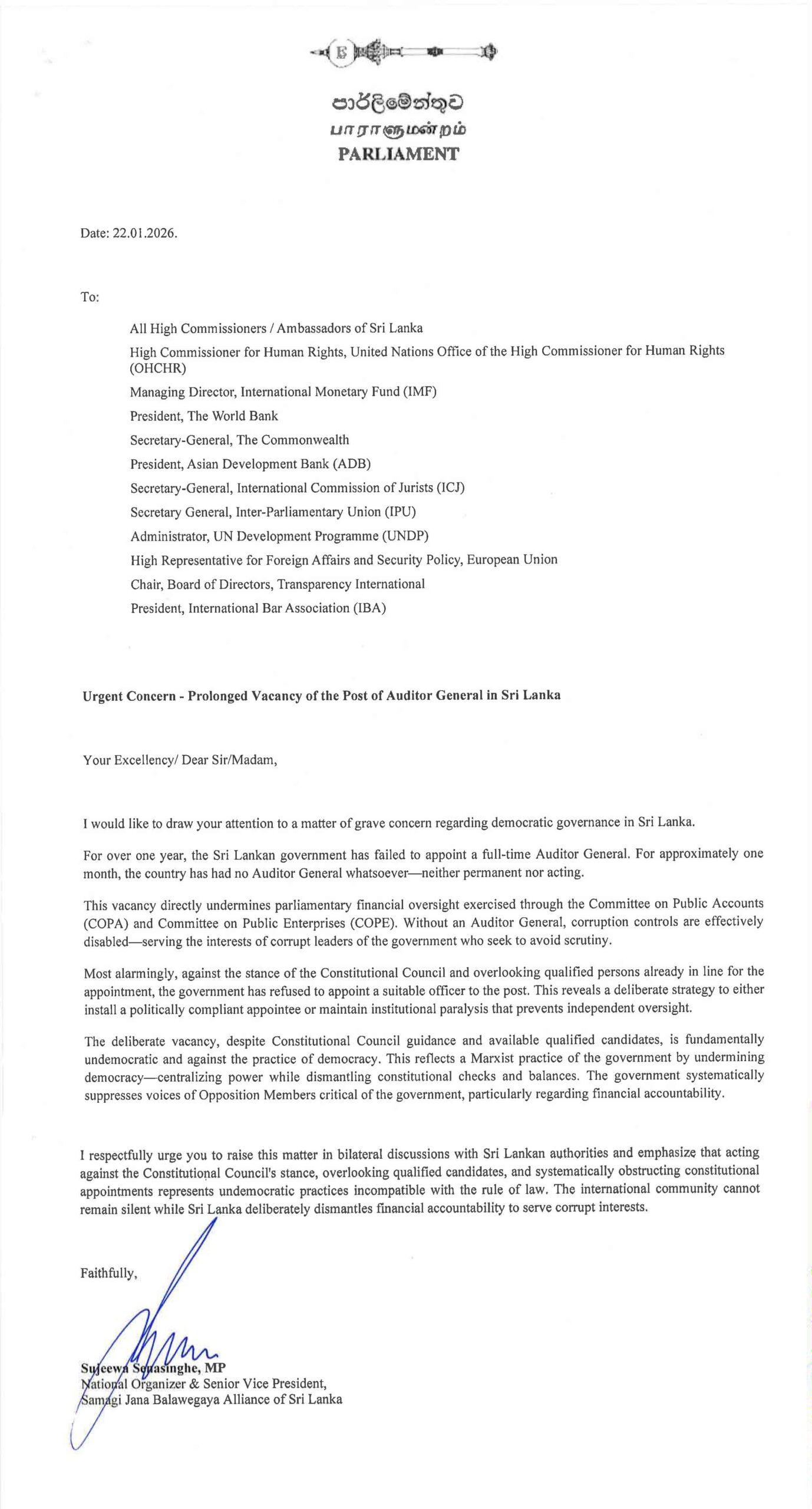 I respectfully urge you to raise this matter in bilateral discussions with Sri Lankan authorities and emphasize that acting against the Constitutional Council’s stance, overlooking qualified candidates, and systematically obstructing constitutional appointments represents undemocratic practices incompatible with the rule of law. The international community cannot remain silent while Sri Lanka deliberately dismantles financial accountability to serve corrupt interests.