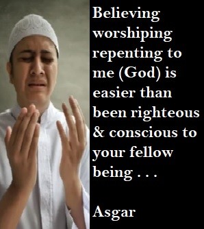 God (Allah)- The law of nature does not makes decisions based on man’s monotheistic religious birth, pronouncement of shahada or his fundamental guidelines but based on a man’s ultimate achievement, how conscientiously and consciously he deals with his fellowmen because without being righteous and conscience to his fellow being, man cannot believe, worship, and repent to God and his messenger in a true sense.