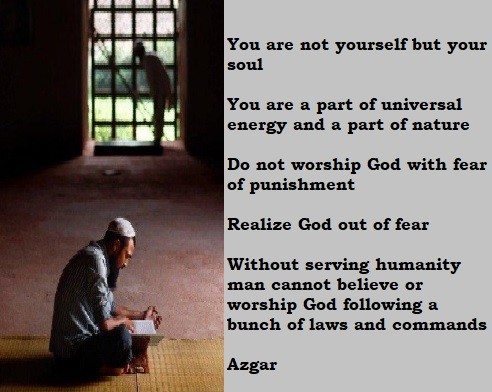 When man serve another man sincerely, modestly, peacefully, content, raise his voice against an injustice, selflessly, simple in appearance and suppress his ego, he unconsciously becomes a believer before a deity.