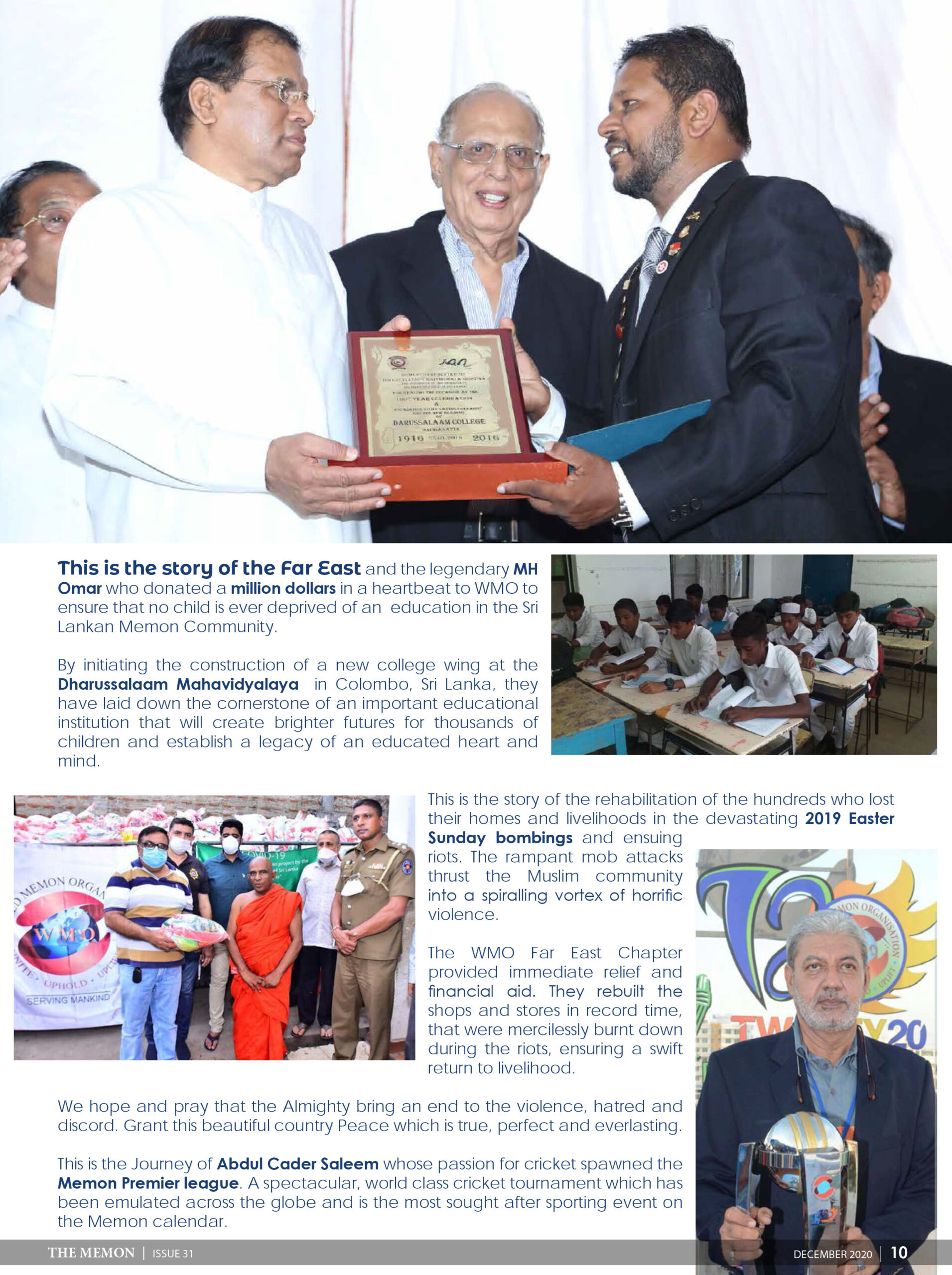 මෙමන්වරු තමන්ට රටක් සොයමින් වසර ගණනාවක් අරගල කල පිරිසක් වන අතර ඔහුන් ඒ සදහා යොදාගන්නා බලවත්ම ආයුධය වන්නේ ආගම සහ ව්යාපාර බව නොරහසකි. 2019 පාස්කු ප්රහාරයෙන් පසුව එවකට ජනාධිපතිව සිටි මෛත්රීපාල සිරිසේන හමුවු මෙමන්වරු ඩොලර් මිලියනයක පරිත්යාගයක් කල අතර පසුව ඔහුන්ගේ The Memon නැමැති සගරාවේ 2020 දෙසැම්බර් කලාපයේ එය වාර්තාකර තිබුනේ ශ්රී ලංකා මේමන් ප්රජාව තුළ කිසිදු දරුවෙකුට අධ්යාපනය අහිමි නොවන බව සහතික කිරීම සඳහා WMO වෙත ඩොලර් මිලියනයක් පරිත්යාග කළ බවයි.